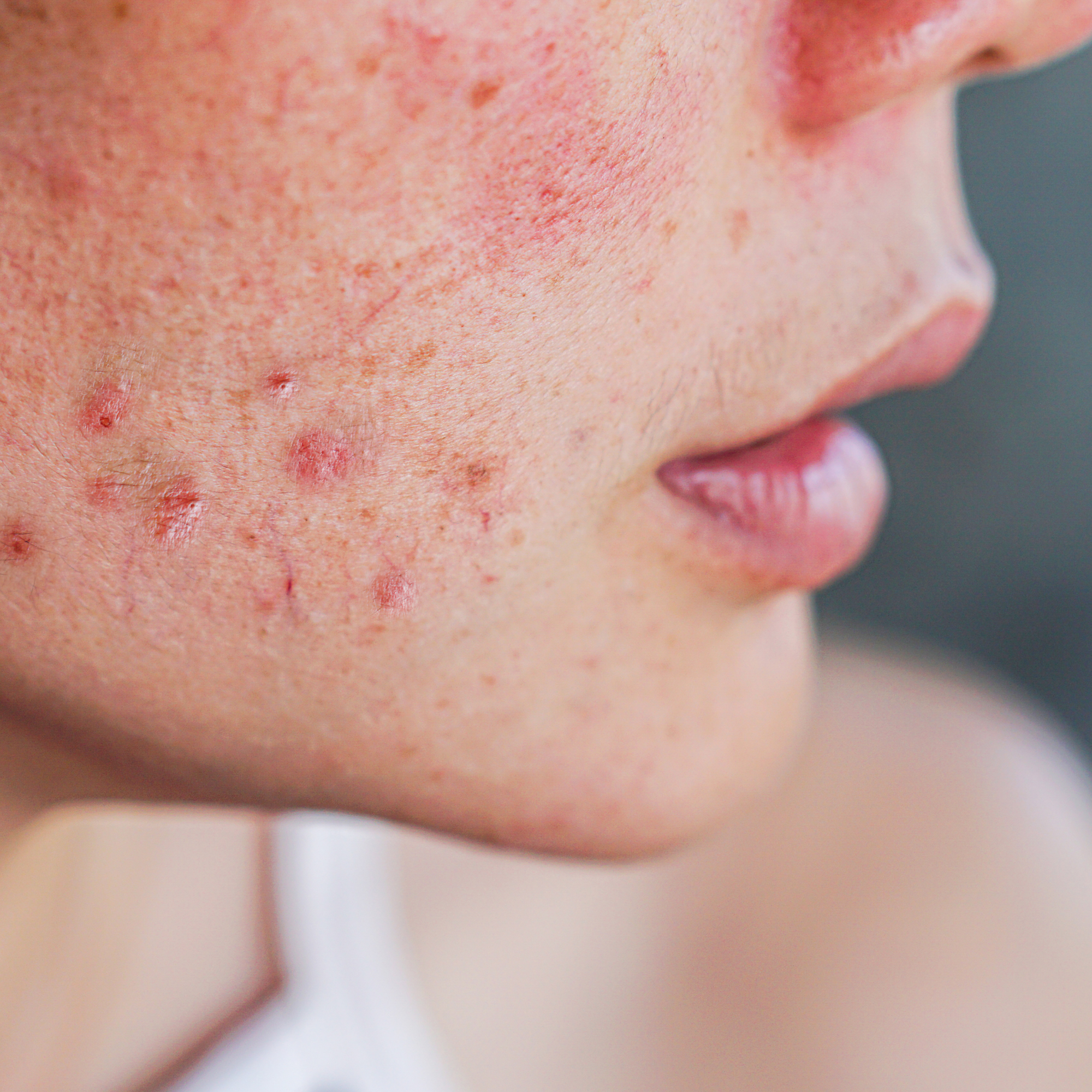 Acné inflamatorio con brotes activos y piel inflamada. Pieles Grasas.